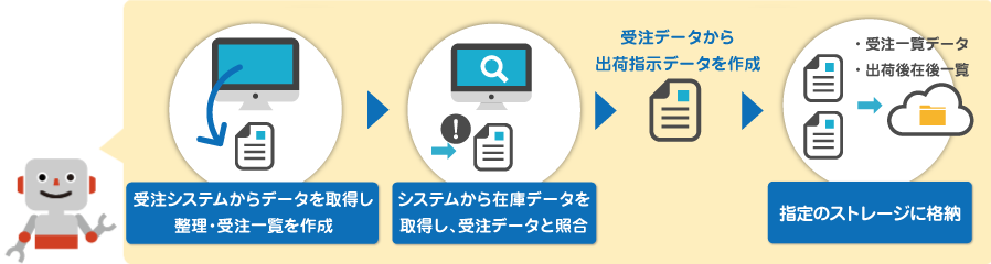 - Q社様では、毎朝約120社のお客様から受注システムで受注を受け、この受注データを一覧に整理し、在庫データと照合し、出荷指示を行っていました。古い在庫管理システムのためシステム連携ができず、この業務を社員3名で対応されていました。
